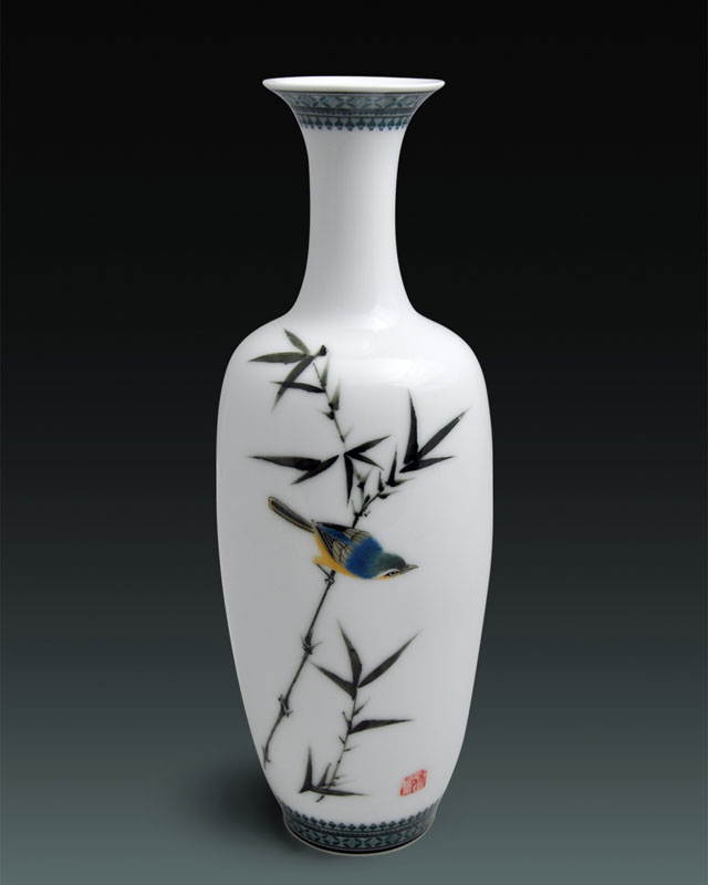 作品名稱:《節(jié)節(jié)高升》瓶材 質(zhì):大球泥工 藝:釉下五彩作品規(guī)格:29CM作 者:黃永平 中國工藝美術(shù)大師