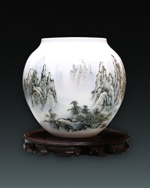 作品名稱:《張家界風(fēng)光》瓶材 質(zhì):大球泥工 藝:釉下五彩作品規(guī)格:18CM作 者:張志堅(jiān) 中國(guó)陶瓷藝術(shù)大師創(chuàng)作日期:2015年產(chǎn)品編號(hào):DQN-P160001