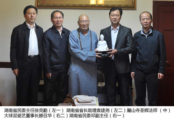 2014年11月5日上午10時(shí)許,在湖南省省長(zhǎng)助理袁建堯、湖南省民委主任徐克勤等一行的見證下,湖南大球泥瓷藝有限公司董事長(zhǎng)滕召華拜訪了中國(guó)佛教協(xié)會(huì)副會(huì)長(zhǎng)兼秘書長(zhǎng)、湖南佛教協(xié)會(huì)會(huì)長(zhǎng)、麓山寺方丈圣輝法師,并親手將046號(hào)《多寶佛》(釋迦牟尼佛瓷塑像)捐贈(zèng)給圣輝法師、永久收藏于麓山寺。