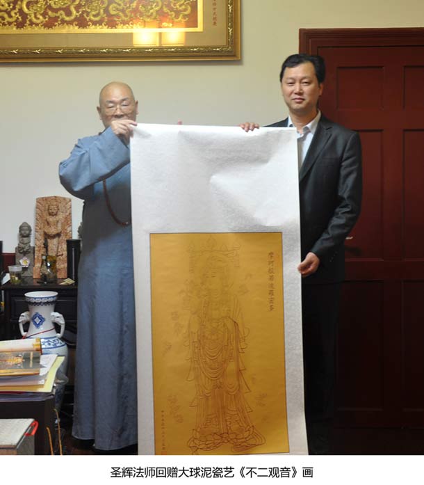 圣輝法師大贊《多寶佛》(釋迦牟尼佛瓷塑像)工藝精湛,表情細(xì)膩,是他見過(guò)的精致的瓷雕佛像。他說(shuō),大球泥瓷藝捐贈(zèng)這么珍貴的佛像是在做大善事,塑造佛像、弘揚(yáng)佛法更是功德無(wú)量,與佛結(jié)緣的人都會(huì)一生平安。同時(shí),圣輝法師還將自己收藏的《不二觀音》畫回贈(zèng)給大球泥瓷藝收藏。