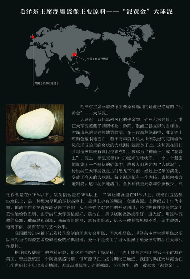 大球泥是偉晶巖風(fēng)化物,雪白球狀體,形似恐龍蛋;含鋁量極高,含鐵量極少,是制作陶瓷的稀缺原料。至今世界只發(fā)現(xiàn)兩個礦源,一個是英國,二戰(zhàn)時枯竭;一個是湖南雪峰山,上世紀八十年代枯竭,F(xiàn)存于世就一百多 噸,絕大部分被大球泥瓷藝公司搶救性保護收藏,并審慎研究、開發(fā)、利用。
