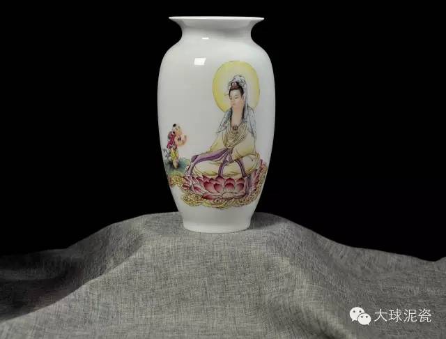 《坐蓮觀音》藕瓶,由省級工藝美術大師制作,瓶高:19厘米,口徑:8厘米,足徑:6厘米!蹲徲^音》因以大球泥為主要原料制成,故瓶體晶瑩剔透,畫面特別溫潤。細細觀察,在燈光的照射下,藕瓶泛著淡淡的青光,好似深秋一輪皓月,恬靜、溫潤。其作品刻畫出來的觀音菩薩有著雍容智慧、悲憫天下的儀態(tài)。而觀音和蓮花歷來是藝術大師在創(chuàng)作中所喜愛的題材,二者結合,寓意美好,表現(xiàn)出了對于幸福美好生活的向往。如今,人們對瓷器藝術品更加重視瓷器的品質與美感,還有其藝術價值。大球泥因它本身的材質,煅燒出了釉面晶瑩、胎質堅硬的優(yōu)質瓷。
