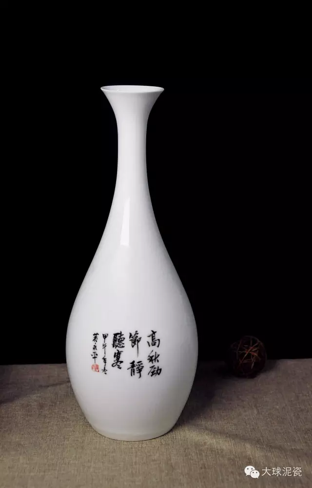 《高秋靜節(jié)》瓶,由省級工藝美術(shù)大師創(chuàng)作,瓶身高:35厘米,口徑:6厘米,足徑:8厘米。以大球泥為主要原材料,高溫?zé)贫,瓶身曲線優(yōu)美柔和,瓷質(zhì)溫潤如玉,份量感十足!陡咔镬o節(jié)》瓶,長頸削肩,腹下豐滿,賦予了整個瓶身高雅氣質(zhì)!陡咔镬o節(jié)》瓶,用大球泥瓷依托繪畫賦予了陶瓷的全新形式,將瓷器更高的藝術(shù)內(nèi)涵展現(xiàn)出來,具有藝術(shù)收藏價值。