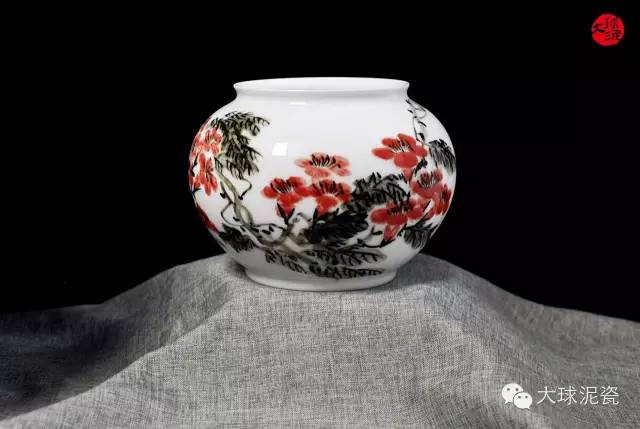 綠蔓如藤不用栽,淡青花繞竹籬開(kāi)。 披衣向曉還堪愛(ài),忽見(jiàn)晴蜓帶露來(lái)。 ——陳宗遠(yuǎn)·《牽牛花》 作品介紹 《壯志凌云》小瓷罐,描繪著一副在深秋的傍晚,紅艷艷的牽牛花璀璨綻放的情景。瓷罐上紅艷的牽牛花和含苞的花蕾,點(diǎn)綴在以濃墨勾畫(huà)的枝葉藤蔓上,不僅映襯出牽;ǖ膵擅,也令畫(huà)面更具層次感。一群從遠(yuǎn)處飛來(lái)的雀鳥(niǎo),使得畫(huà)面活潑生動(dòng),令人感受到在這深秋蕭瑟的景色中,仍感覺(jué)到生命的活力。 從造型上來(lái)看,《壯志凌云》小瓷罐,圓身鼓腹,沉穩(wěn)而古樸,使得整件作品顯得更為高挺,其屹立之姿威武而雄壯。而瓷罐上描繪著在深秋的傍晚,一叢叢紅艷艷的牽;ㄓL(fēng)霜露盛開(kāi),其本意為不肯屈服現(xiàn)實(shí)的殘酷,以一種獨(dú)立、堅(jiān)強(qiáng)、自信向人們展示的豁達(dá)之美。