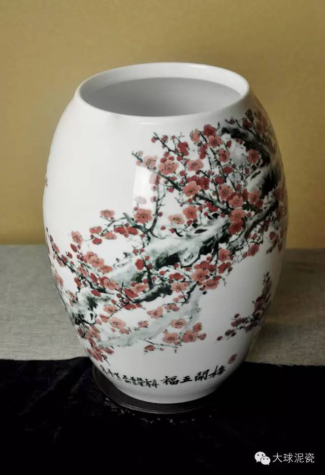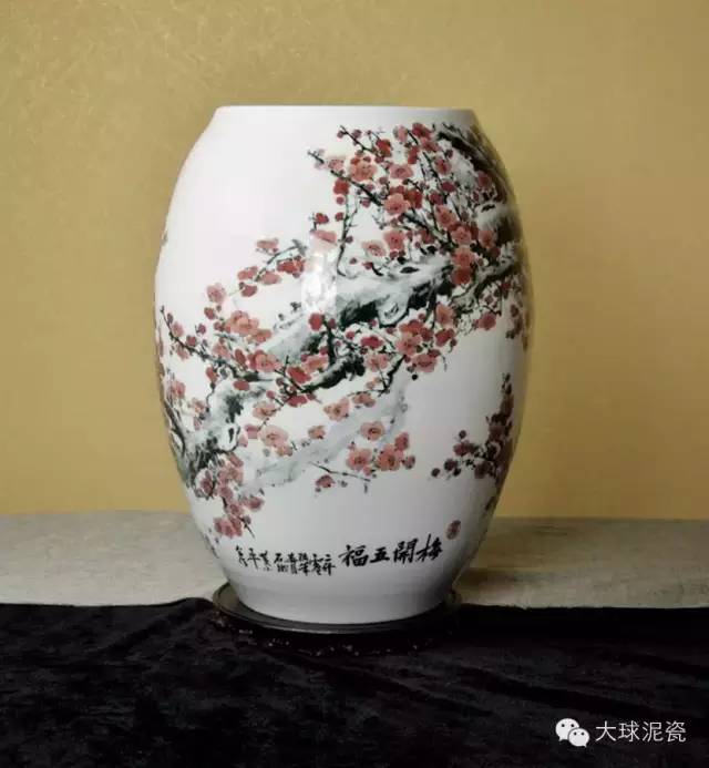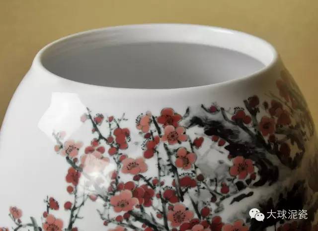 細觀此作品,運用了釉下五彩的工藝手法,圓身鼓腹,器形渾圓飽滿,線條流暢,顏色鮮艷奪目,吉祥喜慶,別有一番風韻。畫面中的梅樹枝干盤根錯節(jié),蒼勁有力。細枝層出,短密交錯。梅花傍枝而生,層層簇簇,競相開放,好一副生機勃勃的景象。