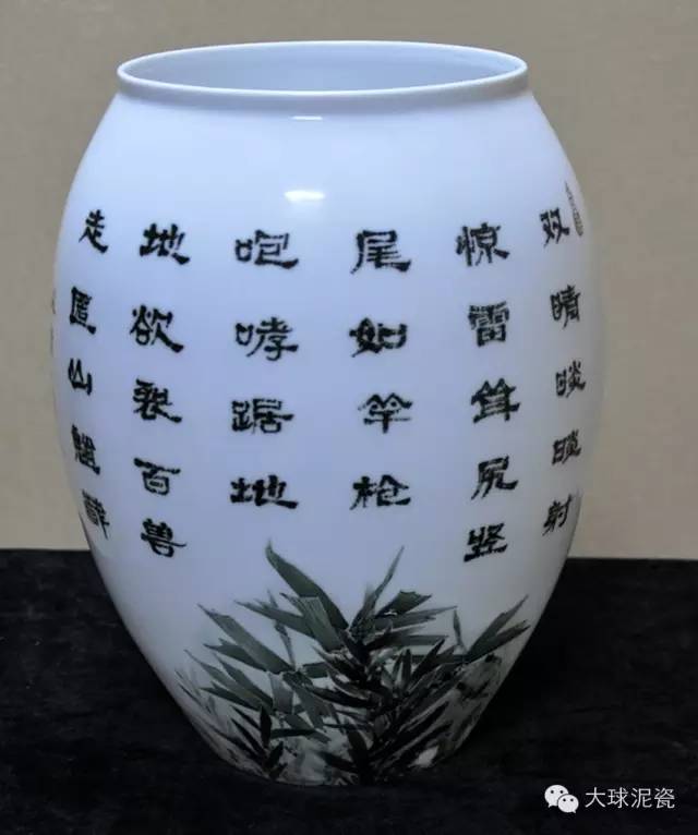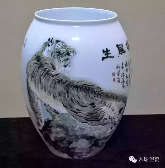 《虎嘯風(fēng)生》瓶由國家級(jí)工藝美術(shù)大師鐘喬清先生和著名畫家陳久云先生共同創(chuàng)作于2007年。口部碩大,象征著虎氣吞山河的氣勢(shì),自腹部向下逐漸內(nèi)收,端莊穩(wěn)重,整個(gè)器型顯得豐滿圓潤,十分大氣。畫面以猛虎、山石為主,幾支竹葉傲然而立。色澤深淺搭配和諧,用墨嫻熟到位,彰顯一種深遠(yuǎn)層次感。一目觀全景,壯闊之至。對(duì)猛虎的描繪極為細(xì)膩,顯示出強(qiáng)烈的質(zhì)感,細(xì)微處絨毛亦形象逼真,觀之恍若活物一般,宛若能聽到其巨大的吼叫聲,如雷貫耳。