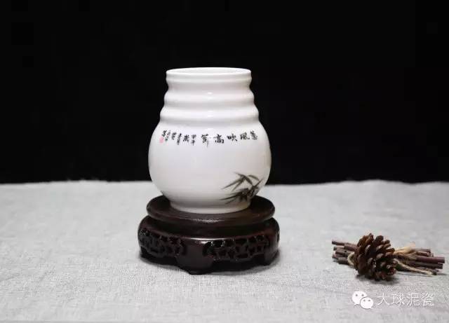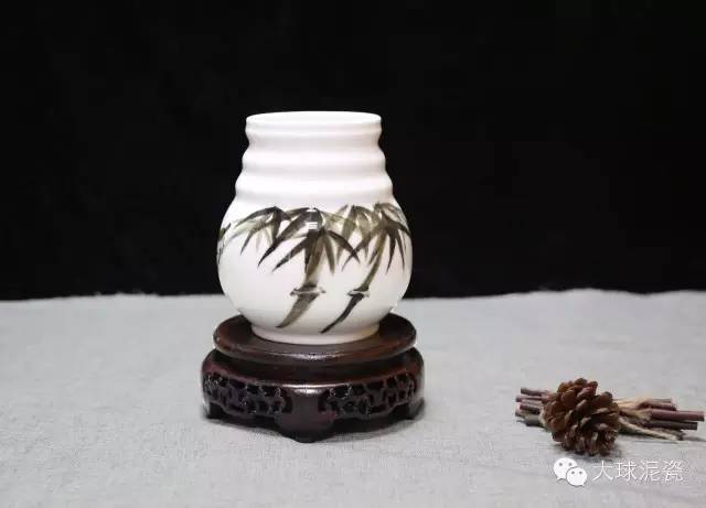 此幅作品設(shè)計靈感源自竹節(jié),造型別致,兼具了竹剛直柔韌的神韻與大球泥瓷淡雅脫俗的氣度。整幅畫面構(gòu)圖簡潔清爽,以清淡雅麗的筆墨畫疏朗清竹兩枝,枝干挺立,葉片參差交錯,通過墨色的濃淡變化顯示出不同的層次。筆墨細(xì)膩,風(fēng)格飄逸,將修竹之挺拔婆娑、堅忍正直之姿,刻畫得生動鮮明,透出一種灑脫之情。