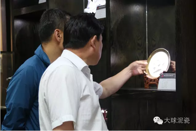 在公司工作人員陪同下,甘處長(zhǎng)一行首先參觀了大球泥瓷精品展示廳,并詢問了大球泥原料的形成、發(fā)現(xiàn)、存量及大球泥瓷的特點(diǎn),對(duì)于大球泥瓷經(jīng)典作品做了仔細(xì)鑒賞。他建議,這么珍貴的作品,每一件都要做好版權(quán)登記,取得保護(hù),防止別人來(lái)仿冒、假冒大球泥作品。