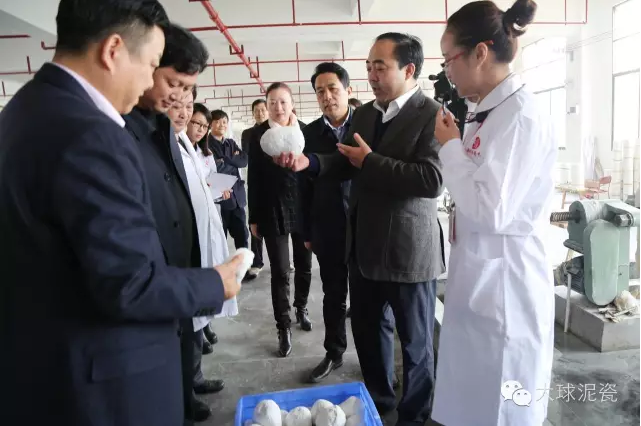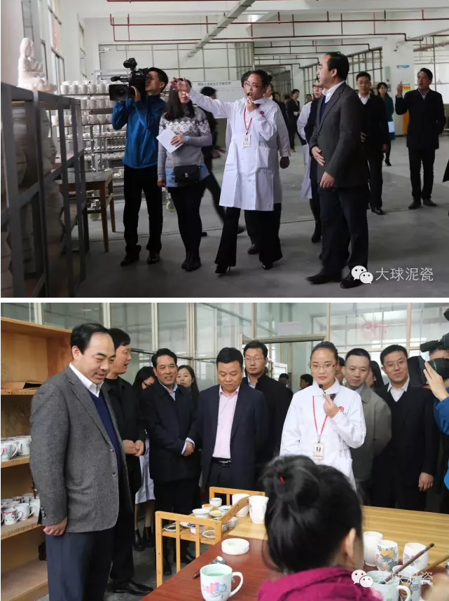 在公司董事長(zhǎng)滕召華的陪同下,陽(yáng)市長(zhǎng)一行下車后直奔大球泥瓷生產(chǎn)、創(chuàng)作區(qū)。在大師創(chuàng)作室,陽(yáng)市長(zhǎng)詳細(xì)詢問(wèn)了釉下彩的繪制工藝及創(chuàng)作靈感等,特別強(qiáng)調(diào)是否原創(chuàng)。來(lái)到練泥及制模區(qū),問(wèn)到器型設(shè)計(jì)情況和大球泥原料的用量配方。陽(yáng)市長(zhǎng)對(duì)大球泥十分了解,他揀起一坨大球泥向隨行人員做起了解說(shuō):大球泥挖掘出來(lái),就是雪白團(tuán)狀,是一種不可再生資源,現(xiàn)已枯竭。上個(gè)世紀(jì)因“毛瓷”而聲名遠(yuǎn)揚(yáng),有著厚重的歷史底蘊(yùn)。目前僅存于世的百余噸大球泥都被滕召華搶救性保護(hù)起來(lái)了,現(xiàn)在是用一坨少一坨!