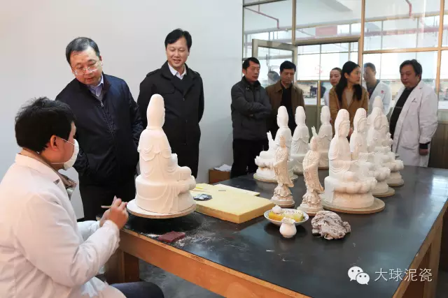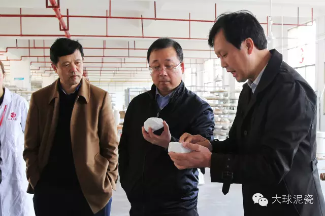 李副廳長(zhǎng)一行在公司董事長(zhǎng)滕召華的陪同下參觀了大球泥瓷大師原創(chuàng)工作室、釉下繪制工作室、瓷雕創(chuàng)作室、泥料煉制工藝、器型創(chuàng)作工藝、質(zhì)量檢驗(yàn)區(qū)等。李副廳長(zhǎng)對(duì)大球泥獨(dú)特的制作工藝十分感興趣,還與正在進(jìn)行創(chuàng)作的瓷雕大師、彩繪大師等進(jìn)行了交流;特別是在煉泥區(qū)對(duì)一坨坨雪白無(wú)暇的大球泥原料感到很是新奇,并對(duì)大球泥瓷在經(jīng)歷99道工序后瓷質(zhì)白度達(dá)到92%而贊嘆不已。