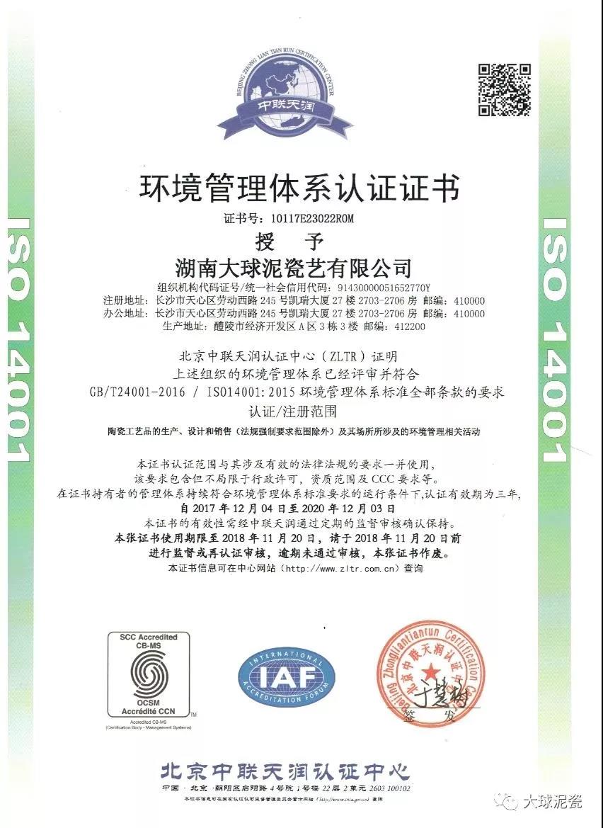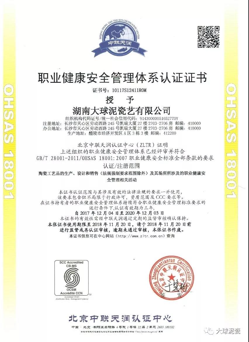 2017年1月05日,湖南大球泥瓷藝有限公司接到質(zhì)量認證機構(gòu)頒發(fā)的環(huán)境管理體系認證、職業(yè)健康安全管理體系,標志著大球泥瓷藝順利通過ISO14001:2015環(huán)境管理體系認證工作、OHSAS 18001:2007職業(yè)健康安全管理體系認證。