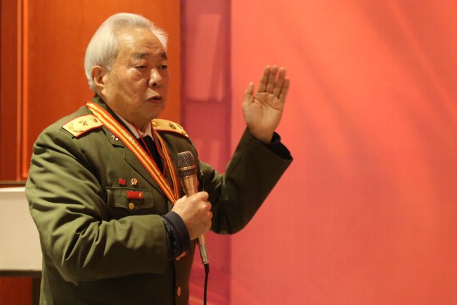 黃祖示將軍是兩彈一星的功勛,在部隊(duì)期間,年年被評(píng)為五好戰(zhàn)士,并被毛澤東主席親自接見。他感慨道,開國(guó)元?jiǎng)讉兪侨嗣竦拇缶刃,沒有老一輩的浴血奮斗就沒有新中國(guó)。動(dòng)情之處,黃祖示將軍起身高歌——“東方紅,太陽(yáng)升……”現(xiàn)場(chǎng)人員隨聲合唱,掌聲雷動(dòng)。