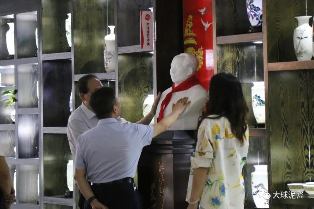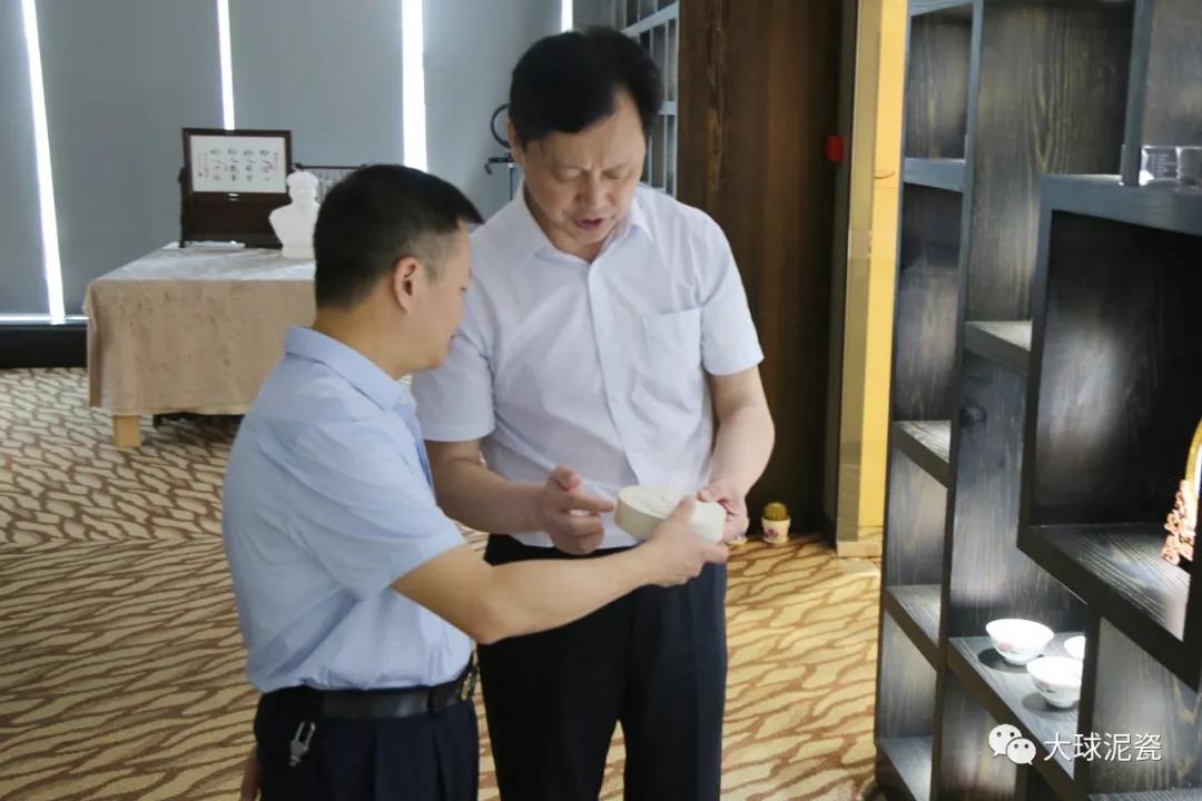 賀廳長(zhǎng)一行首先參觀了公司的精品展廳,常務(wù)副總張萍作了專業(yè)講解。賀廳對(duì)映入眼簾的大球泥原料產(chǎn)生了興趣:“這個(gè)雪白球狀的原料是經(jīng)過(guò)加工提煉的?”滕總回答:“從地下挖出來(lái)就是這個(gè)樣子。大球泥是偉晶巖風(fēng)化物,全部為橢圓球狀,一般在20cm大小, 雜質(zhì)都集中于球體中心形成一個(gè)內(nèi)核,是世上極為稀有的非金屬礦石。”在看到琳瑯滿目的高端藝術(shù)陶瓷時(shí),他被深深吸引了,拿著大球泥作品和普通泥作品在燈光下進(jìn)行比較,發(fā)現(xiàn)一個(gè)白、潤(rùn)、透,一個(gè)黃、渾、淡,問(wèn)兩個(gè)作品的厚度是否一樣,滕董答兩個(gè)作品的厚度、畫(huà)面完全一樣,但品質(zhì)效果明顯不同。郭局長(zhǎng)則打開(kāi)手機(jī)燈光對(duì)大球泥的杯子和優(yōu)質(zhì)泥杯子反復(fù)照探,比較差異。其他領(lǐng)導(dǎo)也是提問(wèn)不斷,工藝技術(shù)、產(chǎn)品質(zhì)量、創(chuàng)作風(fēng)格、市場(chǎng)細(xì)分等等。