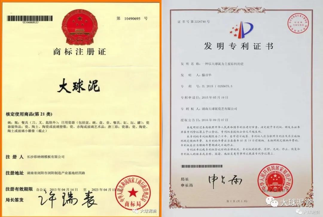二、“大球泥”是注冊商標(biāo)。在國家工商管理總局申請資料上查詢到,2012年1月之前長沙彩納鋼模板有限公司就申請注冊“大球泥”這個(gè)商標(biāo),2013年4月14日國家工商管理總局頒發(fā)注冊商標(biāo)證書。媒體報(bào)道,滕召華通過十余年的不懈努力,前后投入近億元,對大球泥原料及工藝配方進(jìn)行搶救性保護(hù);組織中國工程院院士、陶瓷專家、材料專家對大球泥進(jìn)行深度研究;組織科研人員及工匠,經(jīng)過上百次的配方試驗(yàn),終于獲得了理想的大球泥煉制配方;突破了高溫釉下五彩藝術(shù)瓷的技術(shù)難題,結(jié)合景德鎮(zhèn)青花、德化白瓷雕塑、宜興紫砂壺、臺灣琺瑯彩等工藝技術(shù),發(fā)明了大球泥的獨(dú)創(chuàng)燒制方法。湖南大球泥瓷藝有限公司 自2013年注冊了“大球泥”商標(biāo)之后,又注冊了“大球泥瓷” 、“大泥球”、 “球泥”、“球泥瓷坊”、“白鳳凰”等一系列商標(biāo)。