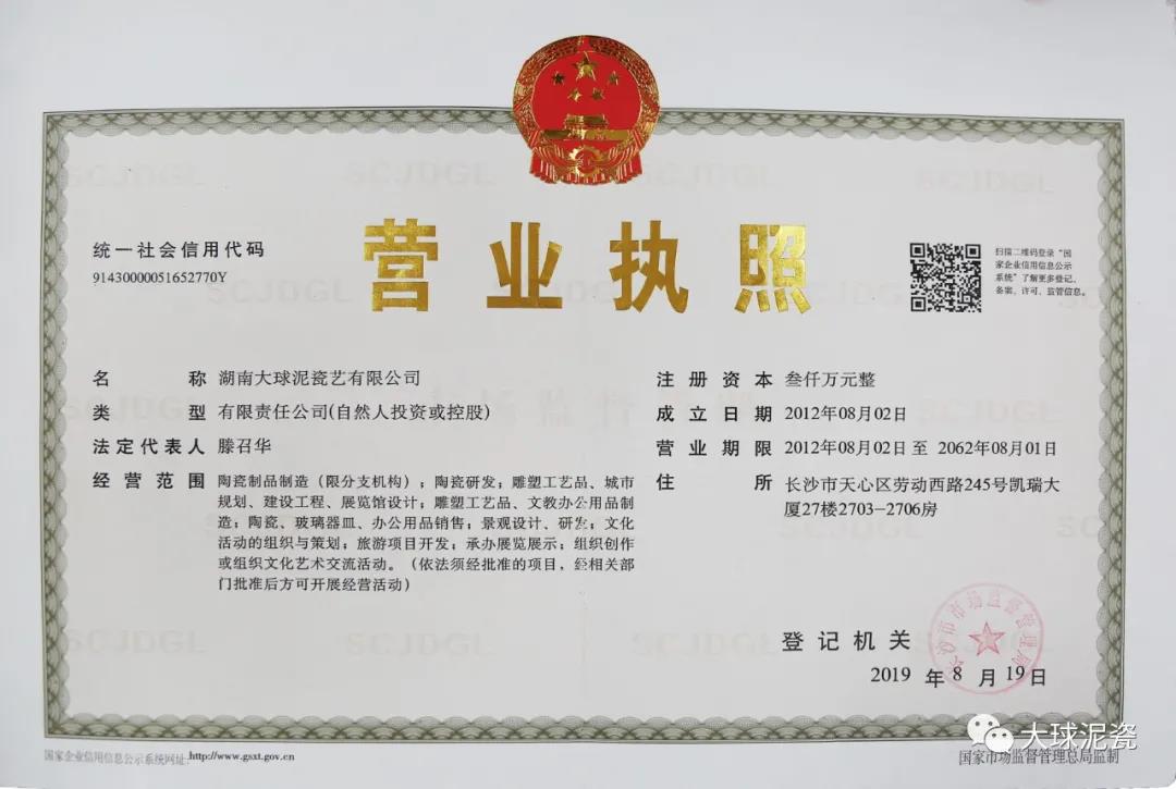 三、“大球泥”是知名企業(yè)。在湖南省工商管理局的企業(yè)注冊登記資料中查詢“大球泥”得知,湖南大球泥瓷藝有限公司于2012年8月2日在湖南省工商管理局注冊成立并領(lǐng)取營業(yè)執(zhí)照,之后又有幾次營業(yè)范圍變更,但是名稱一直沿用至今。在百度上查詢“大球泥”是國家特色文化產(chǎn)業(yè)重點(diǎn)項(xiàng)目、國家高新技術(shù)企業(yè)、湖南省特色文化產(chǎn)業(yè)示范基地、湖南省雙創(chuàng)示范基地等。該公司是我國高端藝術(shù)陶瓷《大球泥瓷》地方標(biāo)準(zhǔn)的制定者,擁有專利近百項(xiàng),“大球泥”也是湖南著名品牌。營業(yè)范圍為大球泥原料研究,高端藝術(shù)陶瓷定制,文旅項(xiàng)目開發(fā),城市品牌策劃,公共文化藝術(shù)工程等領(lǐng)域。
