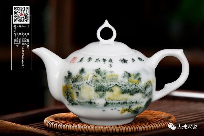 《故鄉(xiāng)情》是由國(guó)家正高級(jí)工藝美術(shù)師滕召華設(shè)計(jì)創(chuàng)意、中國(guó)陶瓷工藝大師張志堅(jiān)手繪。作品用劉少奇同志故居為寫(xiě)實(shí)背景,以秋天樹(shù)葉金黃為意境,寓意落葉歸根、思念故鄉(xiāng)。作品以珍稀大球泥為原料,運(yùn)用國(guó)家非物質(zhì)文化遺產(chǎn),采用釉下手繪方式,經(jīng)1400度高溫,三次燒制而成,瓷質(zhì)集溫潤(rùn)、通透、潔白于一體,具有藝術(shù)、非遺、材料等多重價(jià)值。