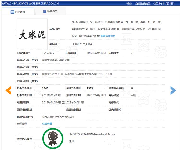 大球泥(國(guó)際分類21類)商標(biāo)注冊(cè)信息