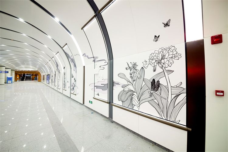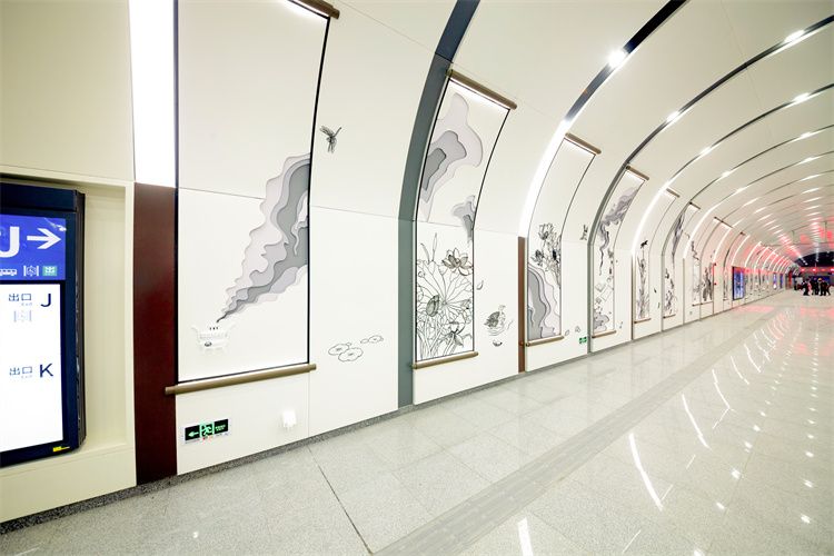 十里河站通過營造國畫的意境,采用現(xiàn)代工藝方式,體現(xiàn)十里河傳統(tǒng)的古玩文化及現(xiàn)代轉(zhuǎn)型升級(jí)。將地鐵空間與周邊文化特色結(jié)合,用瓷器、白描、剪紙、掐絲等組合方式,創(chuàng)作出了《十里河·國畫意境》、《十里河·古趣風(fēng)采》《十里河·方寸之間》、《十里河·魚貫而入》四個(gè)篇章,將“十里長河”的“古意古韻”娓娓道來。