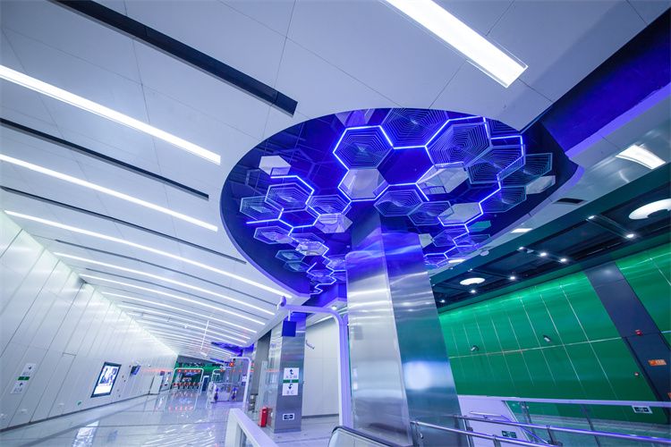 北神樹站則圍繞“智慧之樹”的主題進(jìn)行延伸,將北神“樹”與“生物醫(yī)藥符號(hào)(六邊形)”進(jìn)行藝術(shù)化組合,用流動(dòng)藝術(shù)燈光和六邊形交織穿插,有序無形相結(jié)合,寓意生物科技有序發(fā)展,展現(xiàn)生物科技神秘力量。通過移動(dòng)年輪、生物指紋、流動(dòng)漣漪等形式,描述生命演變、生生不息。讓乘客觸摸現(xiàn)代科技感,體驗(yàn)生命流動(dòng)感,回味人生變化感。