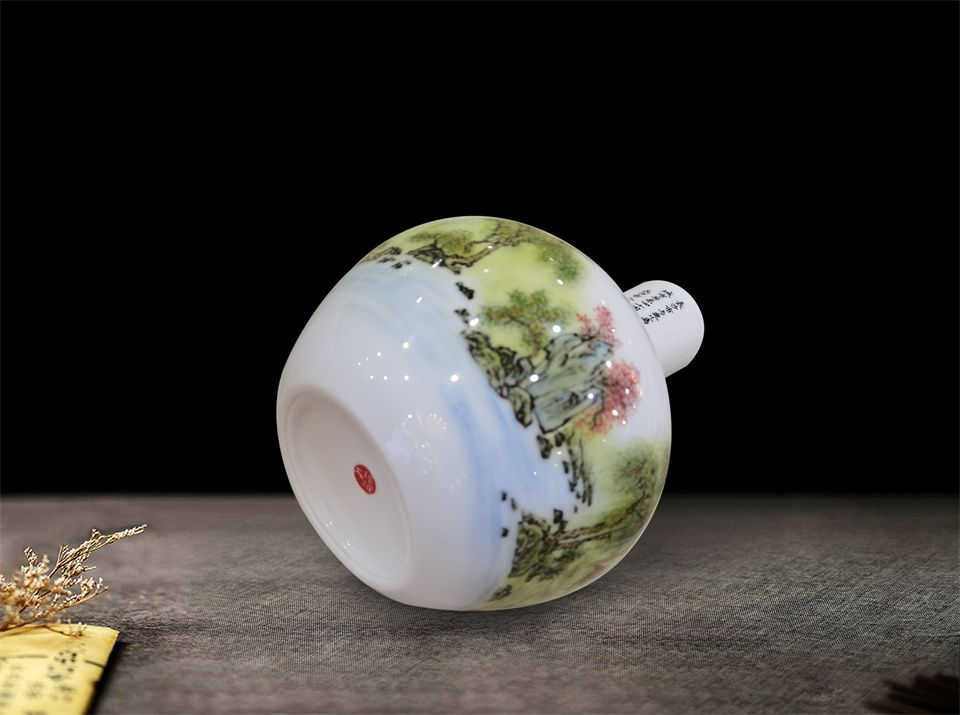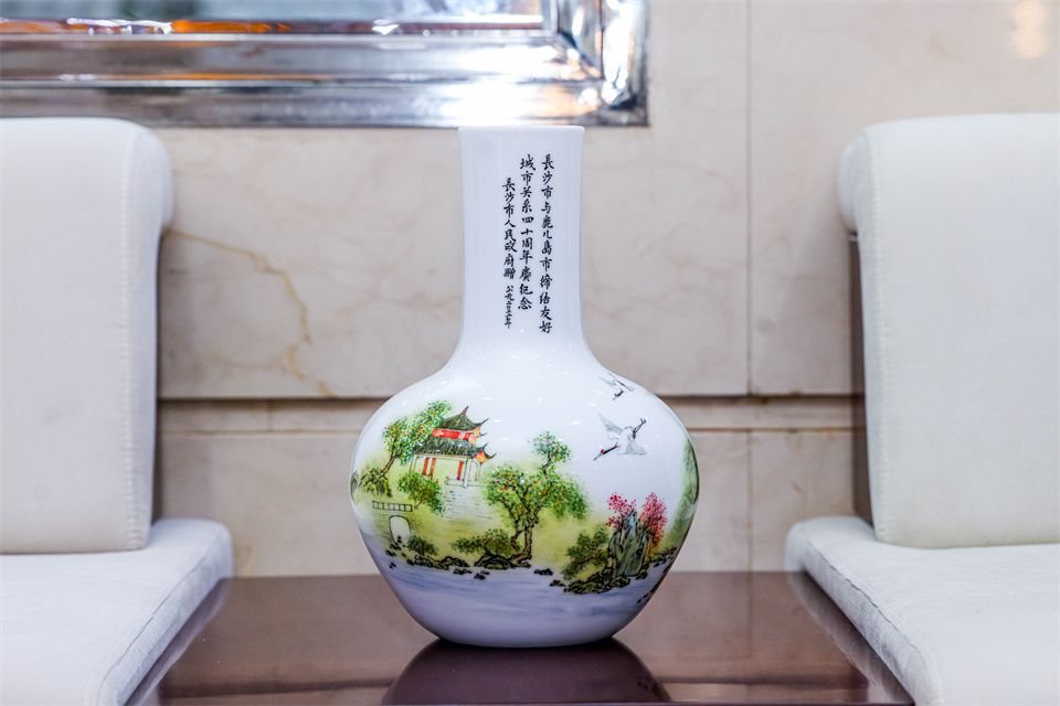 《友誼》瓶,選用中國陶瓷最經(jīng)典器型,瓶型為直口、長頸、豐肩、圓腹、淺圈足,造型古典端莊,線條優(yōu)美圓潤。以稀缺大球泥為原料,用釉下高溫工藝三次燒制而成。畫面以兩個(gè)城市最具代表性的風(fēng)景為題材,長沙的岳麓山愛晚亭與鹿兒島的櫻島火山景交相輝映、融為一體,寓意兩個(gè)城市山水相依、睦鄰友好、共同發(fā)展。